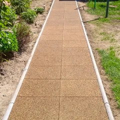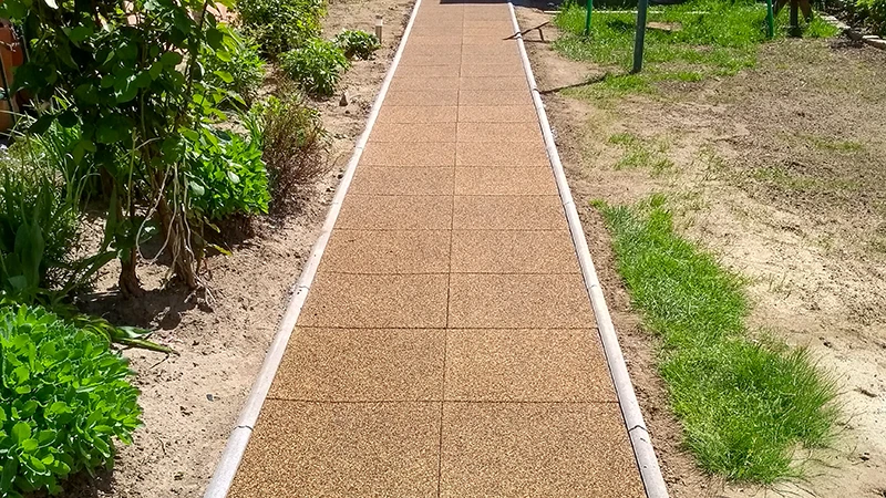 Mit Gehwegplatten aus PU-gebundenem Gummigranulat von WARCO schaffen Sie dauerhafte, witterungsbeständige Wege, die sich leicht verlegen lassen und angenehm zu begehen sind – ob barfuß, in Gartenschuhen oder auch mit High Heels.