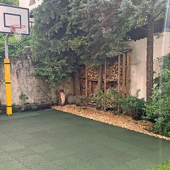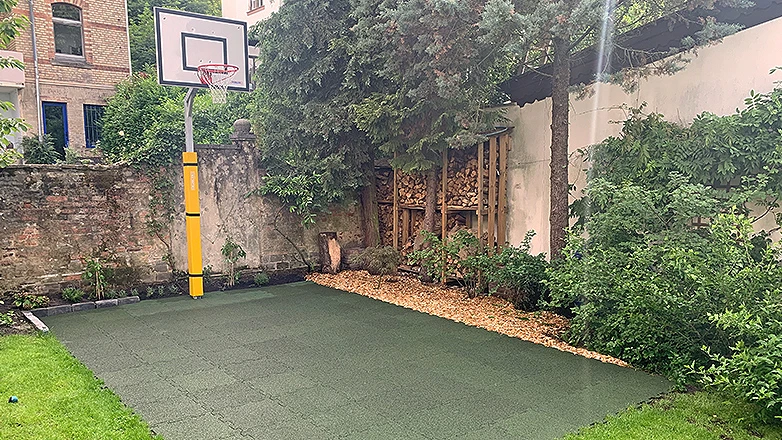 • Für einen Basketballkorb an der Hauswand oder am Carport werden einfach 18 mm dicke Sportbodenplatten auf das Betonverbundpflaster oder den Asphalt der Einfahrt verlegt.