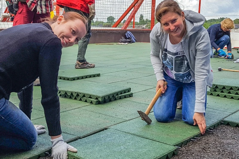 Les parents souriants font eux-mêmes la pose de tapis antichoc WARCO au cour de récréation d’école de leurs enfants.
