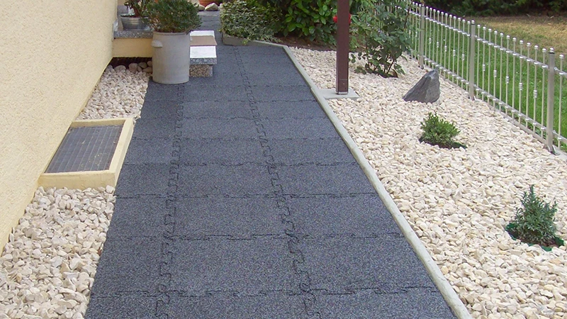 Avec les dalles en granulés de caoutchouc liés au PU de WARCO, vous créez des allées durables et résistantes aux intempéries, faciles à poser et agréables à marcher – pieds nus, en chaussures de jardin ou même en talons.