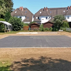 • Pour un petit terrain de jeu dans le jardin ou sur un espace vert, on réalise une couche de base en grilles alvéolées de plastique sur laquelle on pose ensuite des dalles de jeu de ballon de 30 ou 40 mm d'épaisseur - en général sans bordure particulière.