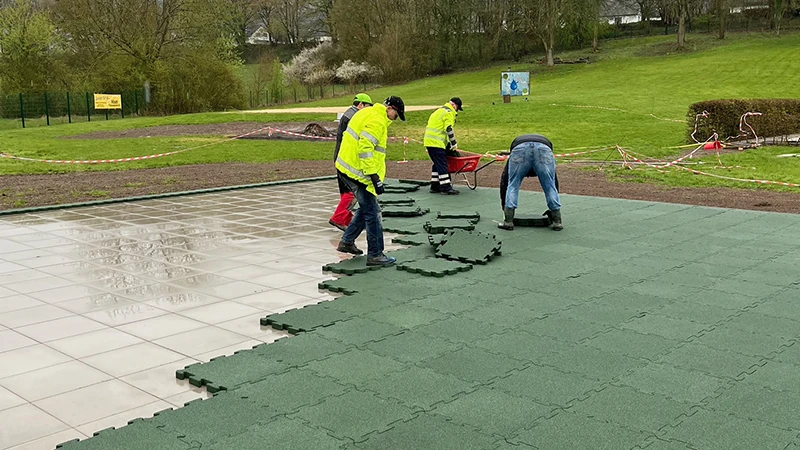 Un sol de terrain de jeu WARCO se compose de dalles pratiques dont les bords sont munis d'une fermeture en queue d'aronde. Lors de la pose, les dalles individuelles s'assemblent ainsi pour former un tapis de dalles solidement fixé.