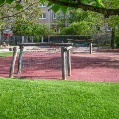 • Un grand terrain de football ou un terrain de basket-ball est posé sur les grilles alvéolées de plastique avec ou sans protection contre le gel, en fonction du sol. Des dalles de jeu de ballon d'une épaisseur de 40 mm sont utilisées comme surface de jeu.