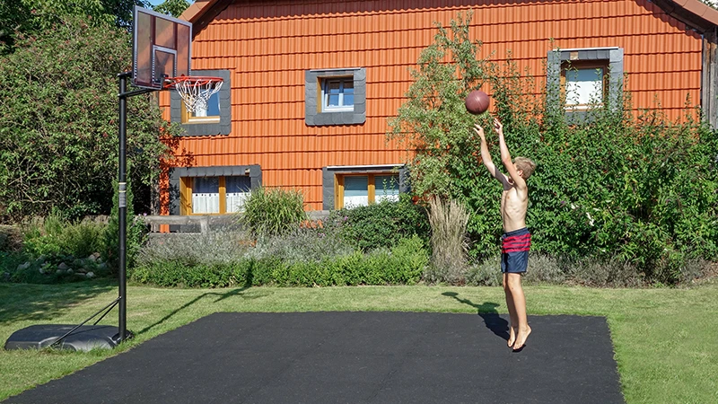 • Pour un panier de basket-ball sur le mur de la maison ou sur l'abri de voiture, il suffit de poser des dalles de sol sportif de 18 mm d'épaisseur sur le pavé en béton composite ou sur l'asphalte de l'allée.