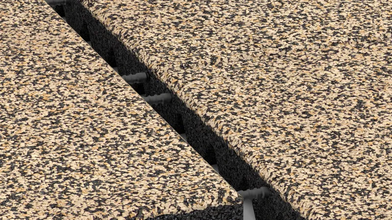 En extérieur, WARCO recommande un support durablement stable et perméable à l’eau. Des solutions éprouvées incluent des dalles alvéolées en plastique (stabilisateurs de graviers) ou une base liée et drainante comme le béton drainant. Si le support n’est pas perméable, une pente minimale de 1,5 % doit être prévue pour permettre l’évacuation des eaux. La pose sur sable, gravier ou concassé est déconseillée – ces matériaux se déplacent sous les dalles souples.