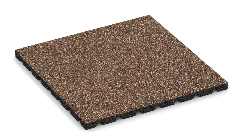 Les dalles sont fabriquées en granulats de caoutchouc liés au PU, avec une surface antidérapante et résiliente. L’épaisseur et la densité déterminent l’absorption des chocs et la hauteur de chute certifiée selon EN 1177. Le format 50 × 50 cm réduit les découpes et permet de remplacer facilement les dalles individuelles si nécessaire.