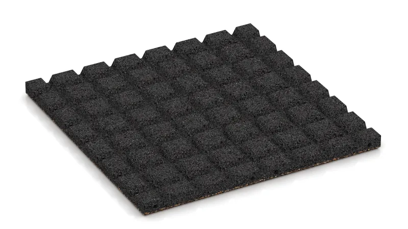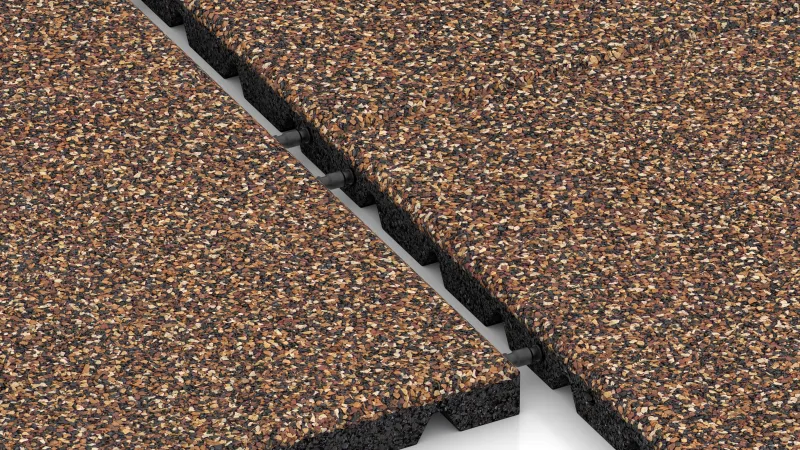 Sur des supports solides comme le béton ou l’asphalte, les dalles peuvent être collées ponctuellement ou en plein avec une colle PU mono-composant. Une liaison collée entre les dalles – notamment en périphérie – renforce la stabilité de l’ensemble. Les dalles d’angle ou de rampe doivent toujours être collées lorsqu’elles reposent sur un support rigide.