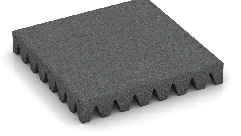 Les dalles sont fabriquées en granulats de caoutchouc liés au PU, avec une surface antidérapante et résiliente. L’épaisseur et la densité déterminent l’absorption des chocs et la hauteur de chute certifiée selon EN 1177. Le format 50 × 50 cm réduit les découpes et permet de remplacer facilement les dalles individuelles si nécessaire.