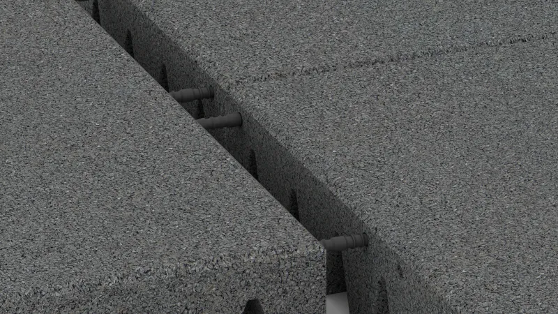 Deux côtés de la dalle présentent un profil positif, les deux autres un profil négatif assorti. Lors de la pose, les dalles s’emboîtent mécaniquement par le dessous et créent une liaison solide et durable. En surface, le résultat est une finition lisse et uniforme avec un motif de joints droit, semblable à une grille ou un damier.