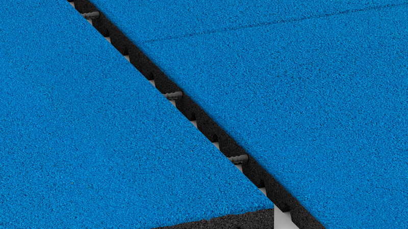 Sur des supports solides comme le béton ou l’asphalte, les dalles peuvent être collées ponctuellement ou en plein avec une colle PU mono-composant. Une liaison collée entre les dalles – notamment en périphérie – renforce la stabilité de l’ensemble. Les dalles d’angle ou de rampe doivent toujours être collées lorsqu’elles reposent sur un support rigide.
