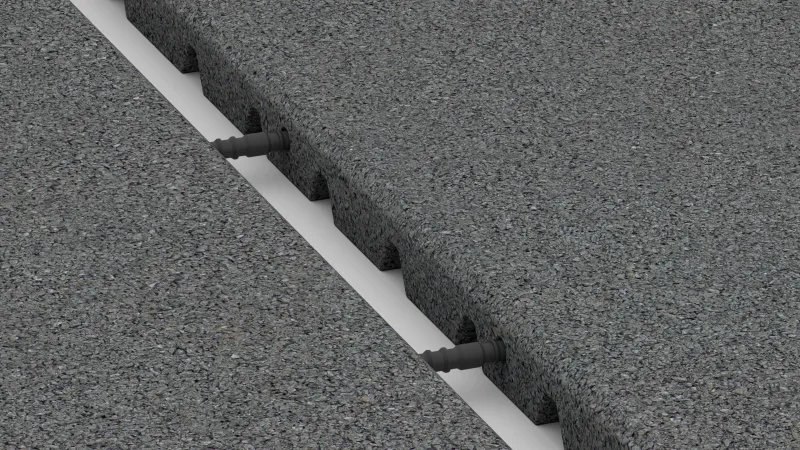 Sur des supports solides comme le béton ou l’asphalte, les dalles peuvent être collées ponctuellement ou en plein avec une colle PU mono-composant. Une liaison collée entre les dalles – notamment en périphérie – renforce la stabilité de l’ensemble. Les dalles d’angle ou de rampe doivent toujours être collées lorsqu’elles reposent sur un support rigide.