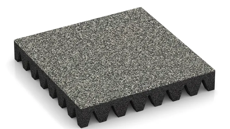 Die Platten bestehen aus PU-gebundenem Gummigranulat mit trittelastischer, griffiger Oberfläche. Dicke und Rohdichte bestimmen das Dämpfungsverhalten und damit die Fallhöhe nach EN 1177. Durch das 50 × 50 cm Raster bleiben Zuschnitte minimal, und Einzelplatten können bei Bedarf schnell getauscht werden.