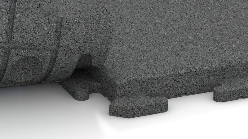 Die Platte besteht aus PU-gebundenem ELT-Gummigranulat, das aus dem Recycling gebrauchter Reifen stammt. Optional ist eine Variante mit einer farbigen Nutzschicht aus durchgefärbtem und UV-beständigem EPDM-Gummigranulat erhältlich. Beide Materialausführungen sind dauerhaft elastisch, robust und umweltfreundlich. Die Oberfläche ist rutschhemmend, trittelastisch und wasserdurchlässig – Regenwasser kann ungehindert in den Untergrund versickern. Dadurch wird der Boden nicht versiegelt, das natürliche Gleichgewicht des Bodens bleibt erhalten und Vegetation oder Baumwurzeln werden nicht beeinträchtigt.