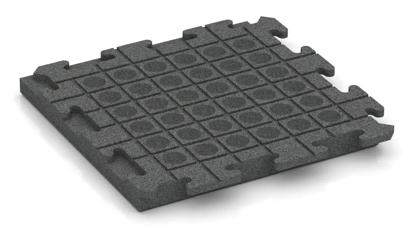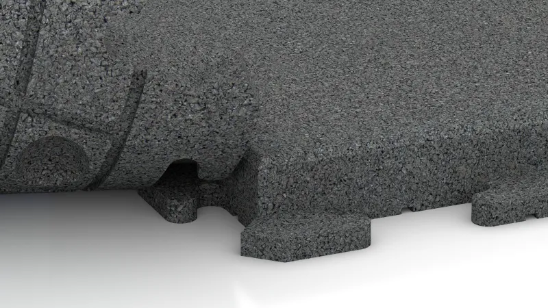 Zwei Plattenseiten verfügen über ein positives Zahnprofil, zwei über ein passendes negatives. Beim Verlegen greifen die Platten von unten formschlüssig ineinander und bilden eine dauerhafte, mechanisch sichere Verbindung. Von oben ergibt sich ein geschlossenes, fugenbündiges Erscheinungsbild mit gleichmäßiger Geometrie, das meist die Form eines klassischen Schachbrettmusters hat.