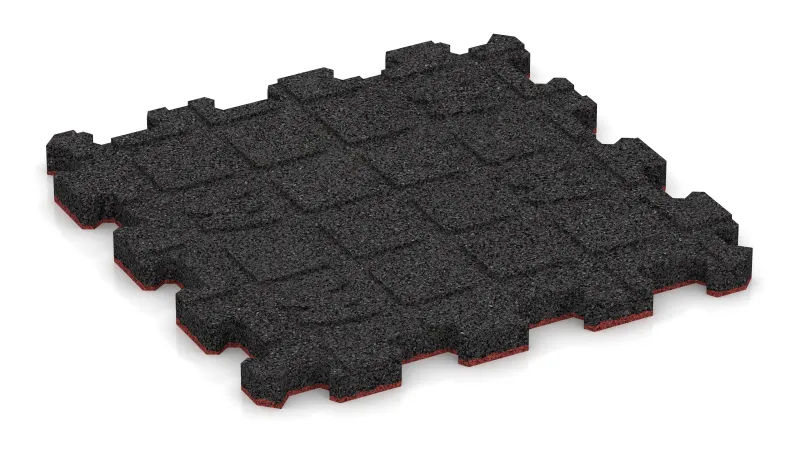 Die Treppenfliese wird aus PU-gebundenem Gummigranulat gefertigt. Zunächst werden großformatige Rohlinge gepresst und zum Ruhen gelagert. Nach einer definierten Reifezeit werden die Fliesen präzise aus den Rohlingen ausgeschnitten. So entstehen kalibrierte Treppenfliesen mit hoher Maßgenauigkeit und gleichmäßiger Oberfläche – ein klarer Vorteil bei Verlegung und Optik.